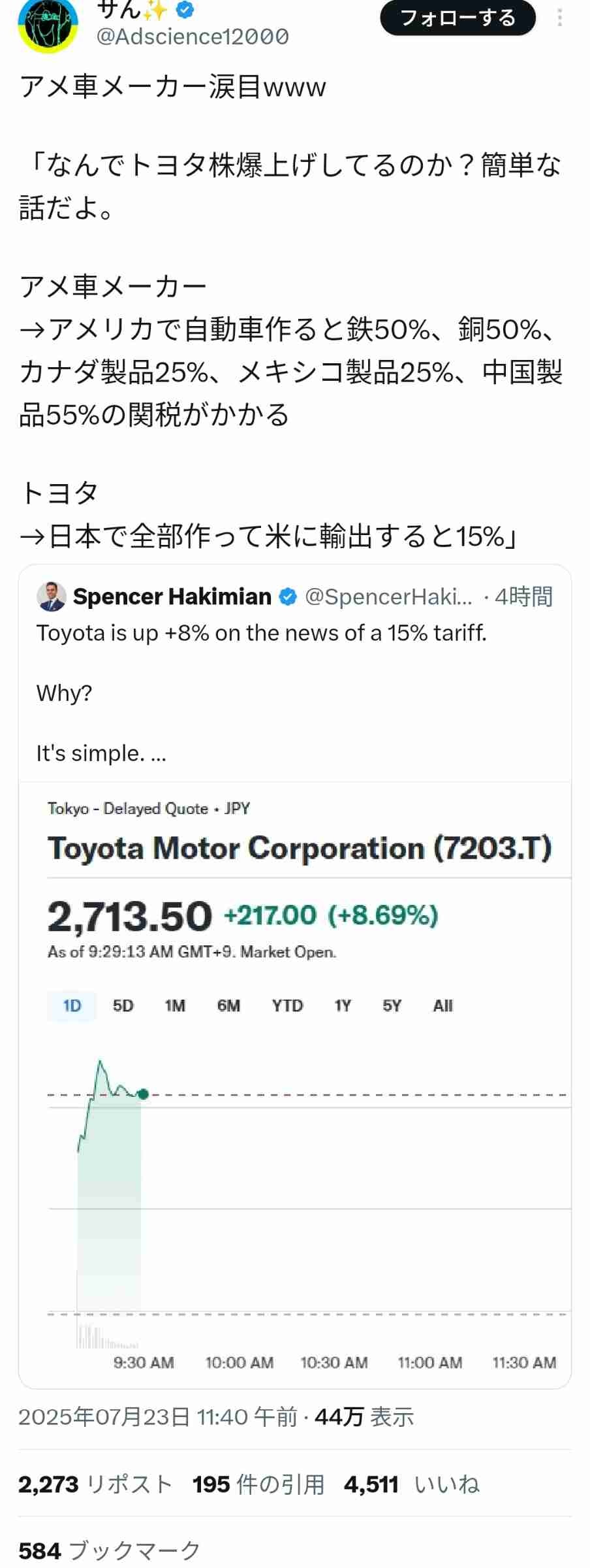 アメ車メーカー涙目www「なんでトヨタ株爆上げしてるのか?簡単な話だよ。アメ車メーカー→アメリカで自動車作ると鉄50%、銅50%、カナダ製品25%、メキシコ製品25%、中国製品55%の関税がかかるトヨタ→日本で全部作って米に輸出すると15%」