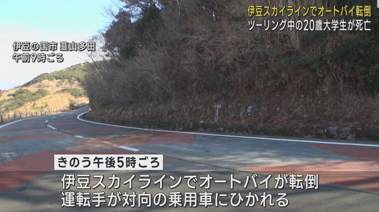 16日、静岡県伊豆の国市でツーリング中のオートバイが転倒し、運転していた大学生が対向車にひかれて死亡しました。16日午後5時ごろ、伊豆の国市韮山多田の伊豆スカイラインで、オートバイが転倒してセンターラインをはみ出し運転手が対向の乗用車にひかれました。