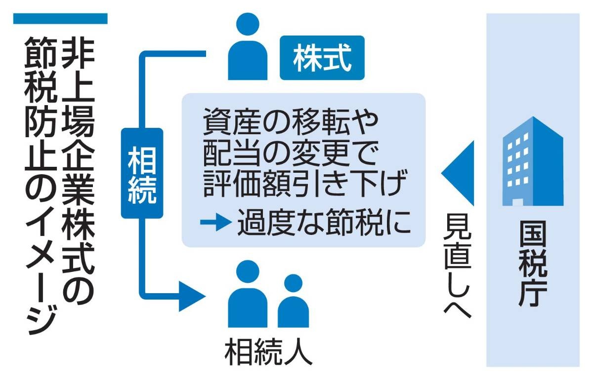政府は20日、非上場企業の株式相続で過度な節税を防ぐため、評価額の算定ルールを見直す検討に入った。相続時に資産を移したり、配当を変更したりして株式の評価額を意図的に下げ、税額を大幅に抑える例が相次いでいた。相続の不公平を是正する狙いがある一方、一部で税負担が増す可能性がある。