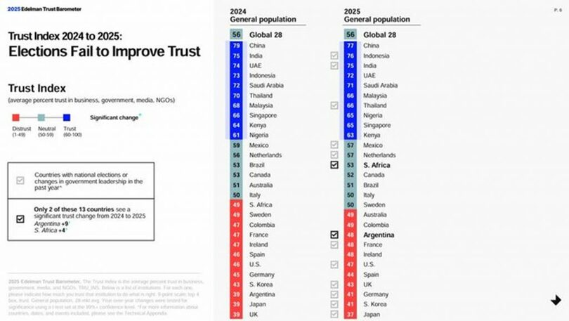 ニュース出所に対する信頼度への懸念を示す割合は58%に達した。エデルマンは特に、昨年総選挙や指導者交代のあった13カ国のうち、信頼度が上昇したのはアルゼンチンと南アフリカだけで、
