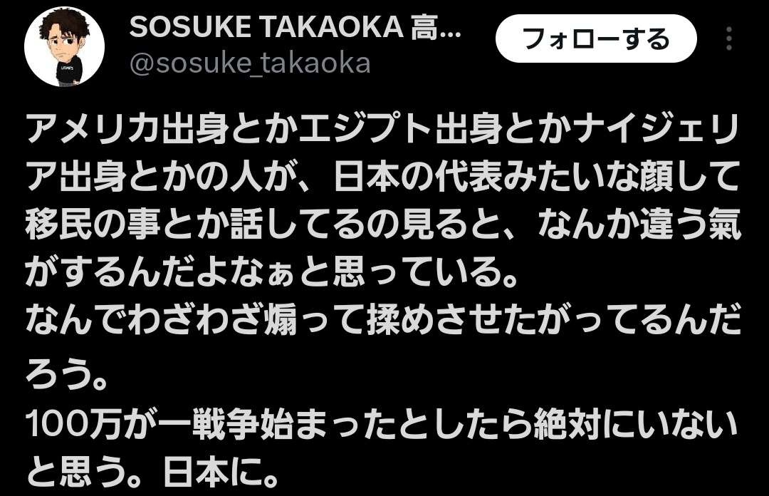 高岡氏「エジプトとかナイジェリア出身の人が日本代表顔で移民のこととか話してるの見ると何か違う」