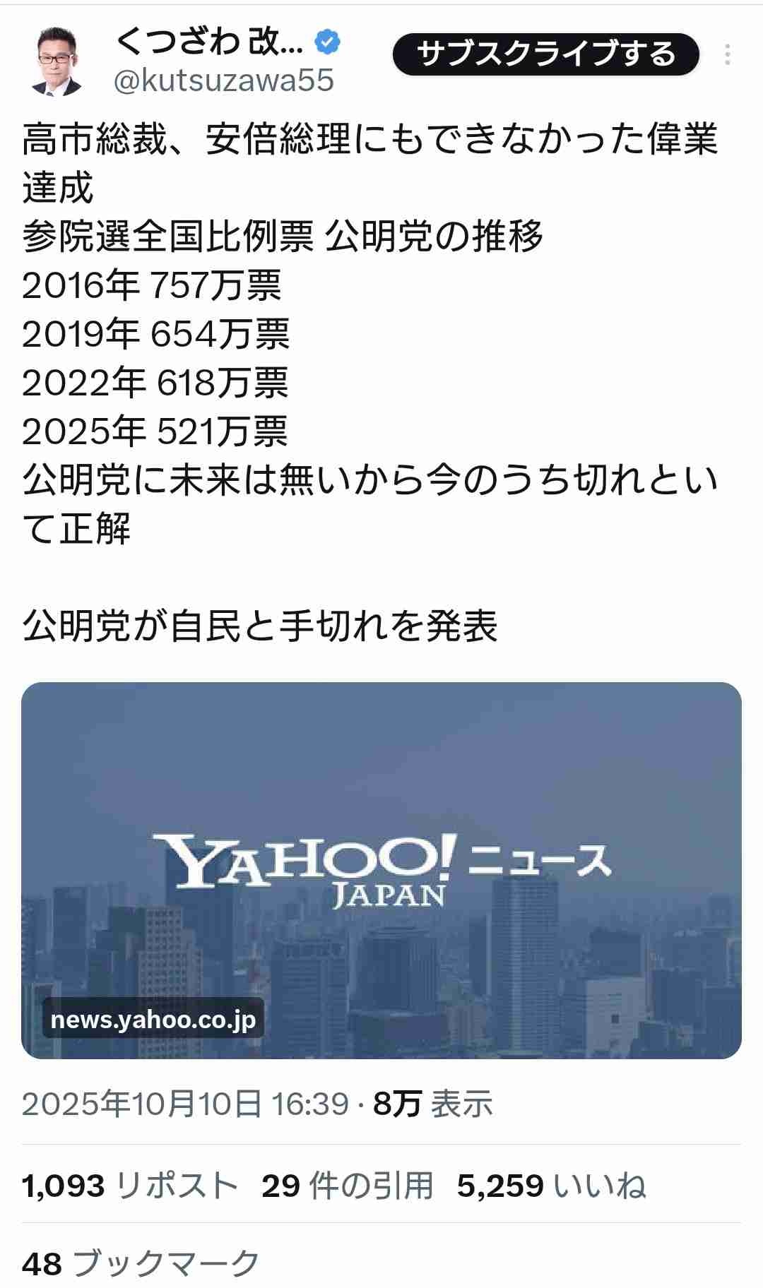 選挙協力してた公明の学会員票のが多いんじゃね - 18 : 2025/10/11(土) 11:40:24.05 ID:vT6OBQAO0