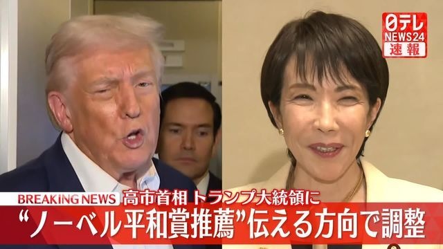 高市首相、トランプ大統領に「ノーベル平和賞推薦」伝える方向で調整