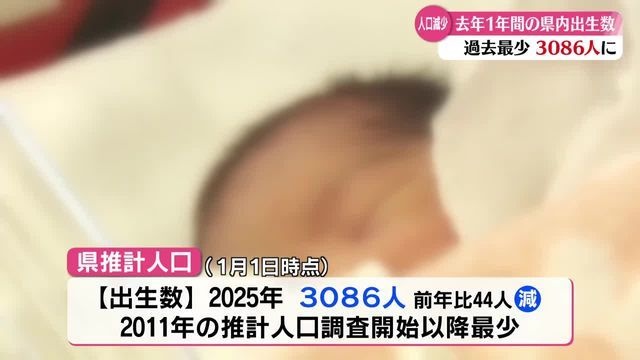 それによりますと、県内で2025年の1年間に生まれた赤ちゃんの数は、過去最少だった2024年より44人少ない3086人で、2011年の推計人口調査開始以降最も少なくなりました。