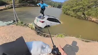 東亜 【中共】 湖に滑り落ちた車の屋根にいた男性を釣り人がルアーを投げて車ごと救出