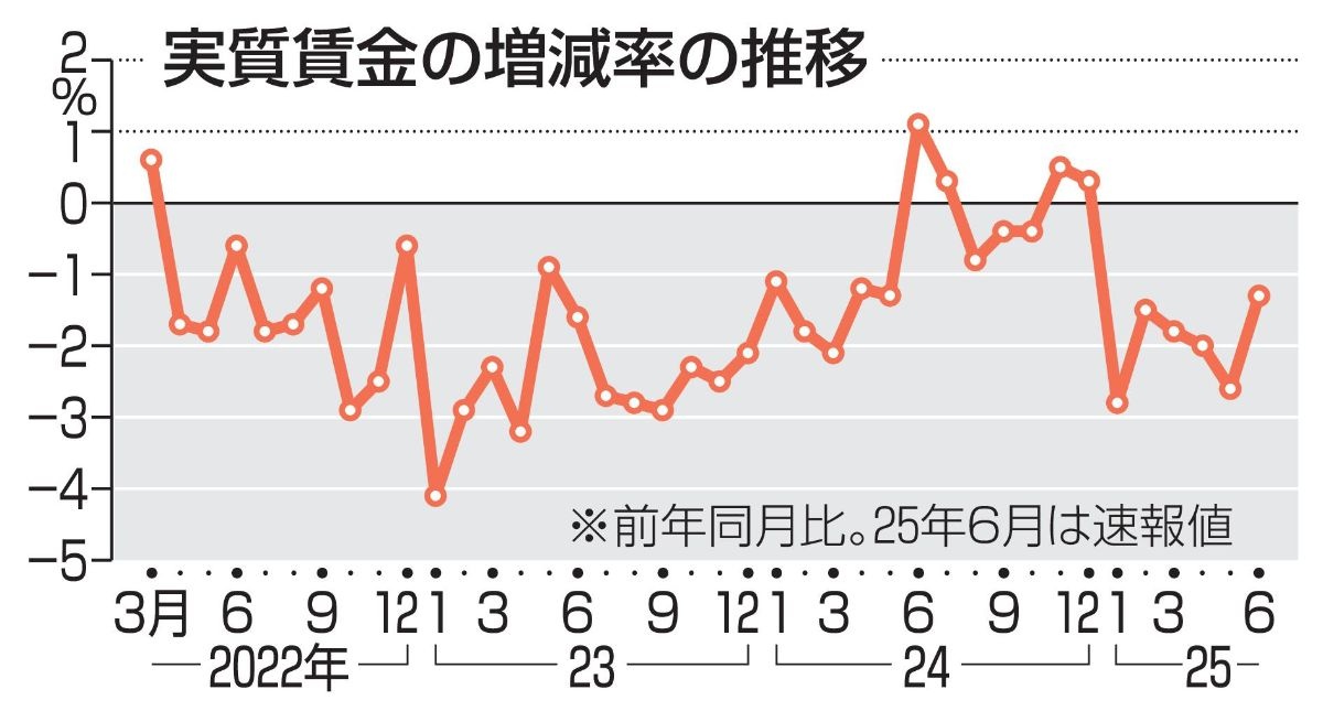 6月実質賃金1.3%減 夏賞与支給でも、物価高深刻