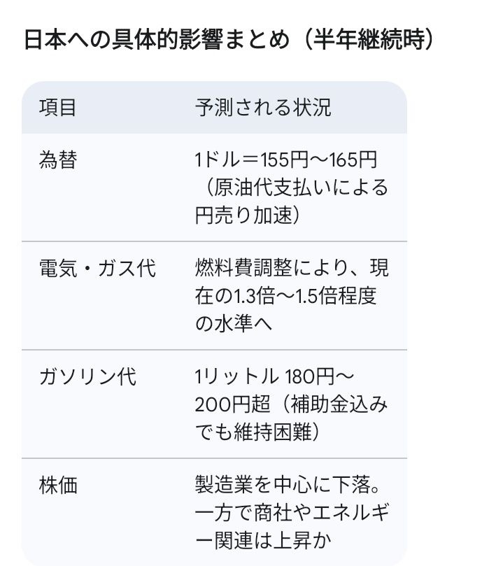 通常、有事の際は「安全資産としての円買い」が起こりますが、今回は**「有事のドル買い」と「原油高による円売り」**が上回る可能性が高いです。1ドル=160円超の懸念: 米国との金利差に加え、日本が輸入する原油代金を支払うためのドル需要(実需の円売り)が急増します。