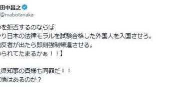 芸スポ 田中昌之、外国人受け入れ問題「日本の法律モラルを試験合格した外国人を入国させろ」「舐められてたまるか」