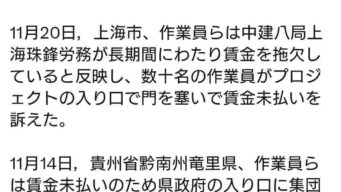 ニュー速 中国金属賃金未払い、中建八局賃金未払い、竜里県賃金未払い、中国交通建設賃金未払い…