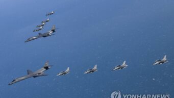 米軍のB-52爆撃機と日本のF-35戦闘機、F-15戦闘機が日本海上空で並んで飛行する様子がこちら