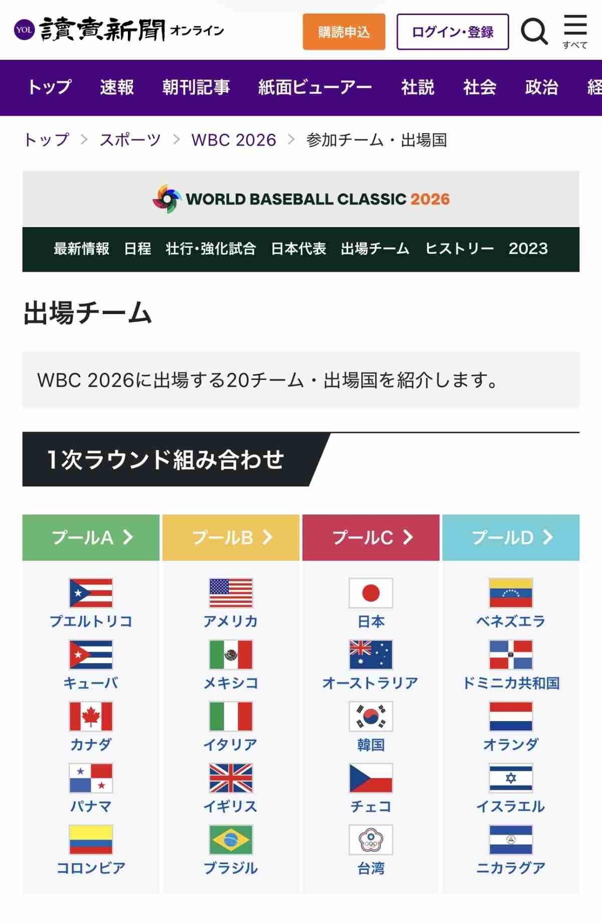 【読売新聞】WBC2026の出場国・20の参加チームを紹介します。第6回ワールド・ベースボール・クラシック、日本代表戦などの最新情報をお届けします。