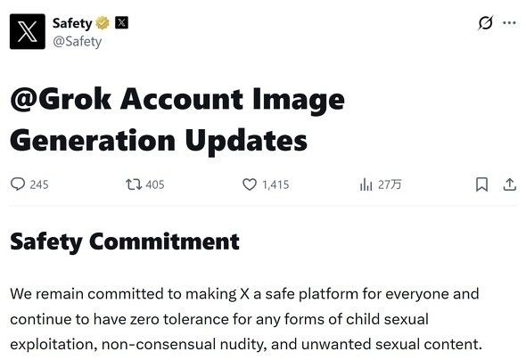 米Xは1月14日(現地時間)、X上のAI「Grok」が児童の性的画像や合意のないヌード画像を生成すると非難されていることを受け、Grokを更新し、「ビキニなどの露出度の高い服装をした実在の人物の画像の編集をGrokアカウントで禁止するための技術的対策を導入した」と発表した。